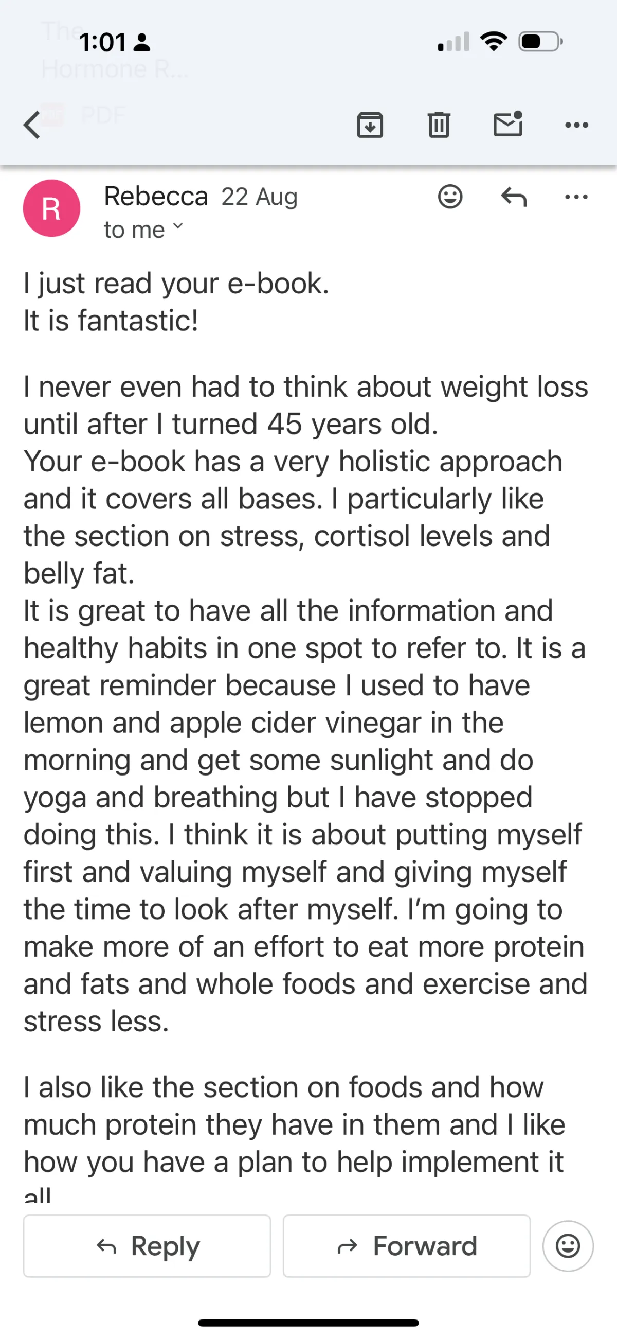Your e-book has a very holistic approach and it covers all bases. I particularly like the section on stress, cortisol levels and belly fat.